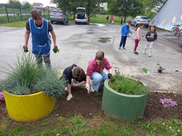 Dopunili smo cvjetnjak novim raznim cvjetovima koje su učenici donijeli od kuće te dodali nove kreativne cvjetnjake koji sad ukrašavaju naš okoliš.