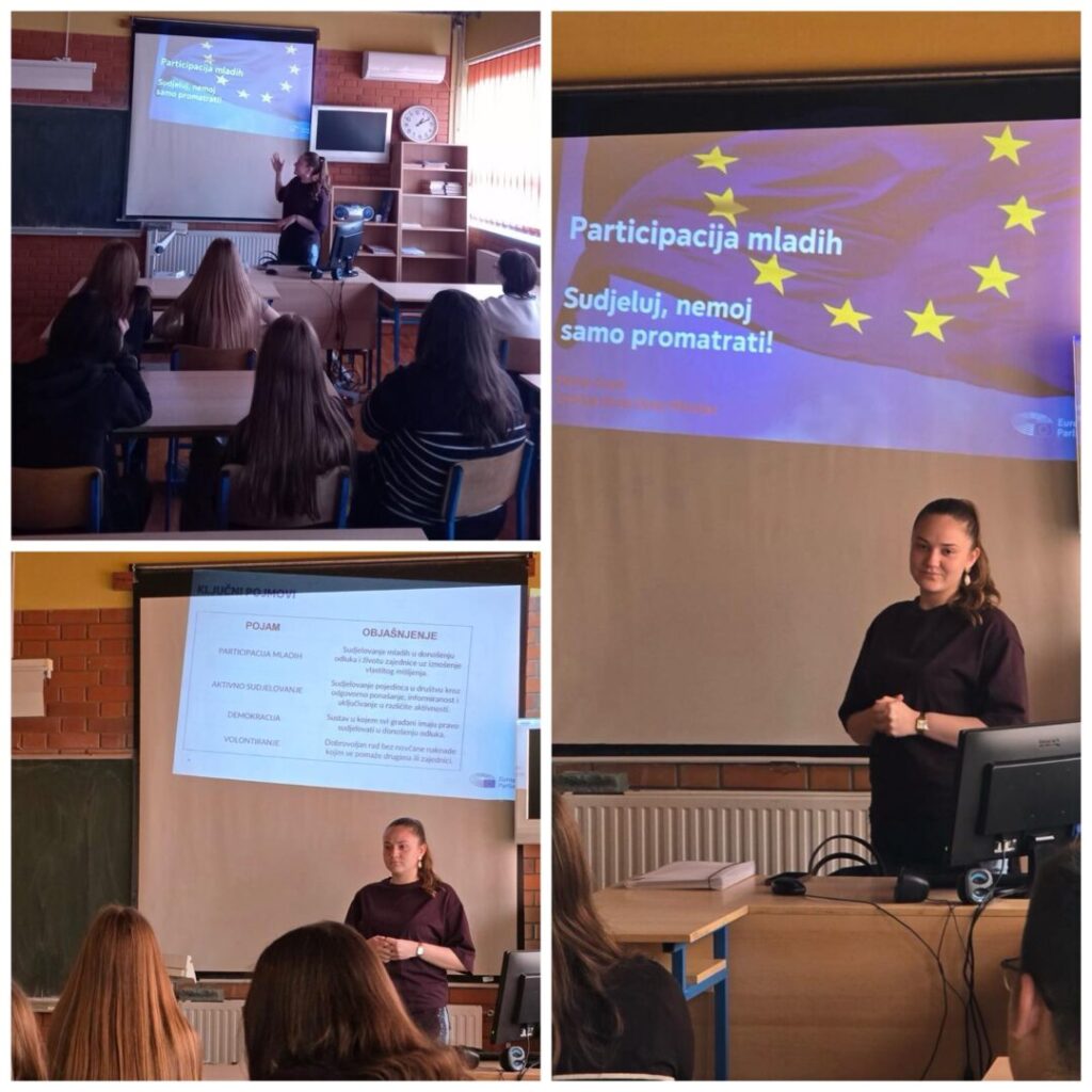 Povratak u osnovnoškolske klupe Marija je iskoristila kako bi mlađim kolegama približila važnost aktivnog uključivanja u društvene procese. Kroz zanimljivu prezentaciju i osobna iskustva iz srednjoškolskih klupa, Marija je objasnila što znači biti aktivan građanin, kako mladi mogu iznijeti svoje ideje, koje mogućnosti im nudi srednja škola i Eurospka unija te na koji način mogu utjecati na promjene u svojoj okolini – bilo u školi, mjestu stanovanju ili šire.